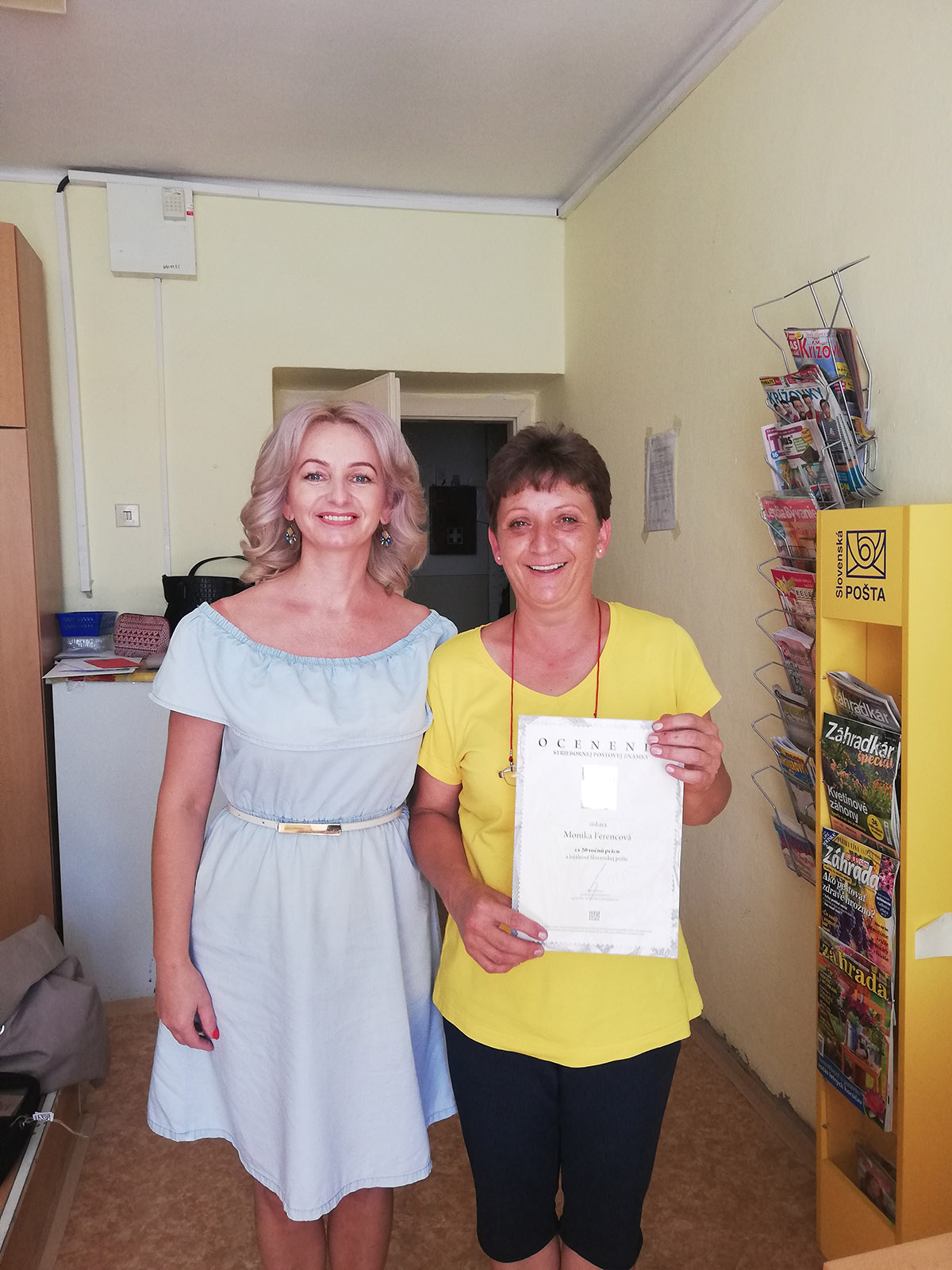 na pošte Krčava sa uskutočnilo odovzdávanie ocenenia zamestnancom, pri príležitosti pracovného jubilea 20 rokov. Práve pani Monika Ferencová pracuje na pošte Krčava, ako poštová doručovateľka už 20 rokov. Pri práci jej pomáha aj služobné auto, ktoré si veľmi pochvaľuje. Oceneniu sa veľmi potešila, čo je vidieť aj na fotografiách.“