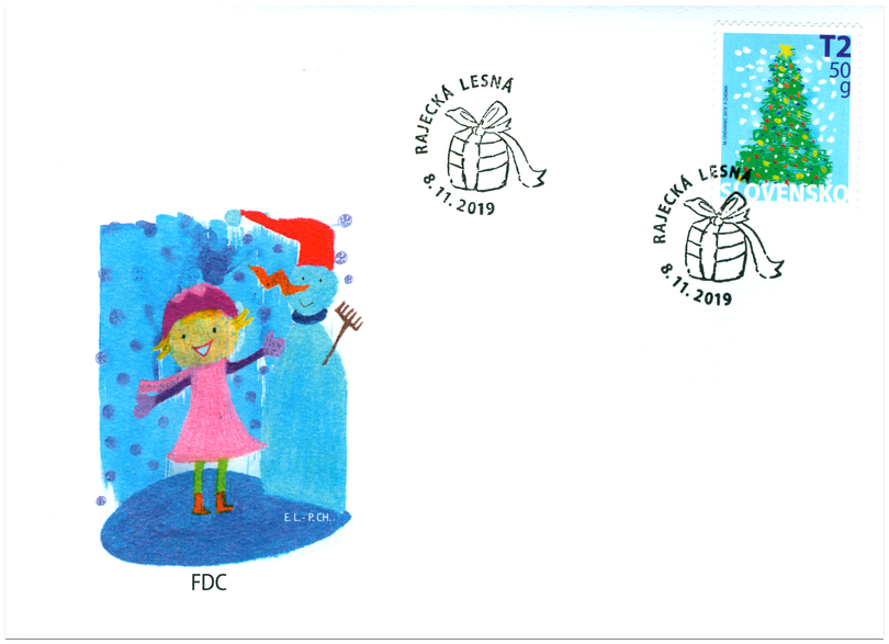 Všetky výtvarné návrhy poštovej známky, FDC a FDC pečiatky boli vybrané z obrázkov detí na základe súťaže organizovanej Slovenskou poštou v rámci projektu Vianočná pošta. Motívom poštovej známky je kresba Maroša Chovanca s motívom vianočného stromčeka. Prítlačové kupóny tvoria dva motívy súvisiace s aktivitami Hnutia kresťanských spoločenstiev detí (eRko). Motív kupónu s troma koledníkmi bol vybraný z návrhov detí z Kene v rámci projektu Dobrá novina, pričom druhý motív s hviezdou akcentuje 25. výročie Dobrej noviny. Súčasne s poštovou známkou bude vydaná obálka prvého dňa s pečiatkou FDC s dátumom 8. 11. 2019 a domicilom mesta Rajecká Lesná. Motívom prítlače FDC obálky je dievčatko so snehuliakom od Emiliána Lakatoša, motívom FDC pečiatky je vianočný darček od Veroniky Glovackej. FDC vytlačila technikou ofsetu spoločnosť BB PRINT.