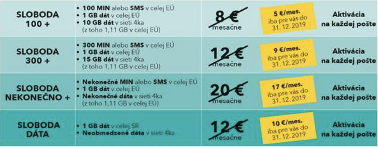 Počas celého roka 2019 ste mali možnosť ako zamestnanci Slovenskej pošty využívať zvýhodnenú ponuku pre vybrané paušály SLOBODA+/ SLOBODA DATA, ktoré sme pre Vás pripravili v spolupráci so 4kou: