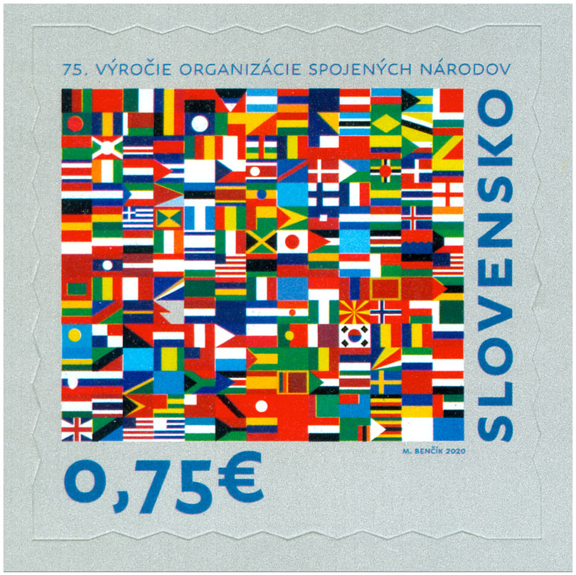 Poštová známka vychádza vo forme samolepky na tlačovom liste s 35 známkami. Motívom poštovej známky sú štátne vlajky členských štátov Organizácie Spojených národov. Súčasne s poštovou známkou bude vydaná obálka prvého dňa s pečiatkou FDC s dátumom 14. február 2020 a domicilom mesta Bratislava. Motívom FDC obálky je objekt geometrickej abstrakcie vytvorený z návrhu známky s akcentovaním vždy jednej farby z vlajky v horizontálnom registri. Motívom FDC pečiatky je model zemegule s vavrínovým vencom. Autorom výtvarného návrhu poštovej známky, FDC, FDC pečiatky je Doc. Mgr. art. Marcel Benčík, ArtD. Organizácia Spojených národov (OSN) združuje 193 všeobecne uznávaných štátov sveta. Hlavnou úlohou a poslaním OSN je udržanie svetového mieru a prevencia vojnových konfliktov cestou diplomatických rokovaní.