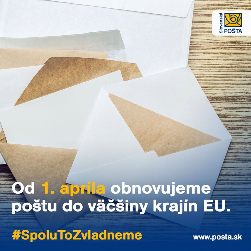 Sme preto veľmi radi, že od 1. apríla opäť zabezpečíme odosielanie pošty (listové zásielky, balíky a zásielky EMS) do väčšiny krajín Európskej únie, s výnimkou Cypru, Grécka, Írska, Malty a Španielska. Mimo krajín EU zatiaľ odosielame poštu len do Bieloruska, Kanady, USA, Srbska, Švajčiarska, Ukrajiny a Veľkej Británie.