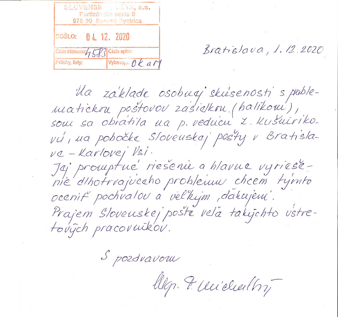 Pani Zuzana Kušníriková 10. decembra 2020 Dobrý deň, táto pochvala ma veľmi potešila. Vždy sa snažím, nielen ja, ale celý kolektív pošty Bratislava 44, robiť všetko pre to, aby od nás odchádzal zákazník spokojný. Každá pochvala povzbudí. Ďakujeme. Zuzana Kušníriková, vedúca pošty BA 44