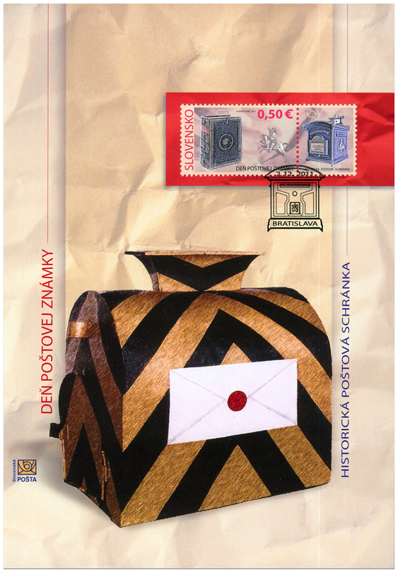 Vývin poštovej schránky od čias habsburskej monarchie po vznik samostatného Česko-Slovenska veľmi dobrým spôsobom reprezentuje emisia poštovej známky Deň poštovej známky z roku 2011, ktorej autorom je renomovaný slovenský známkový tvorca akad. mal. Peter Augustovič. Ústredným motívom poštovej známky je najstaršia známa zachovaná poštová schránka z nášho územia, ktorá bola vyrobená okolo roku 1820 a nachádza sa v zbierkovom fonde Balneologického múzea v Piešťanoch. Podľa riaditeľa múzea PhDr. V. Krupu je miesto pre túto schránku označené na tzv. Frauenfeldovom pláne Piešťan z roku 1824, na ktorom je vyznačený dom „K poštovej trúbke“. Tu bola pobočka hlohoveckej pošty, na ktorej bola umiestnená mobilná poštová schránka z dreva s kovovým držiakom v tvare knihy, ktorá tvorí hlavný motív poštovej známky. Listy tu však boli viac dní a čakali na príchod dostavníka, ktorý ich odviezol na poštu v Hlohovci.