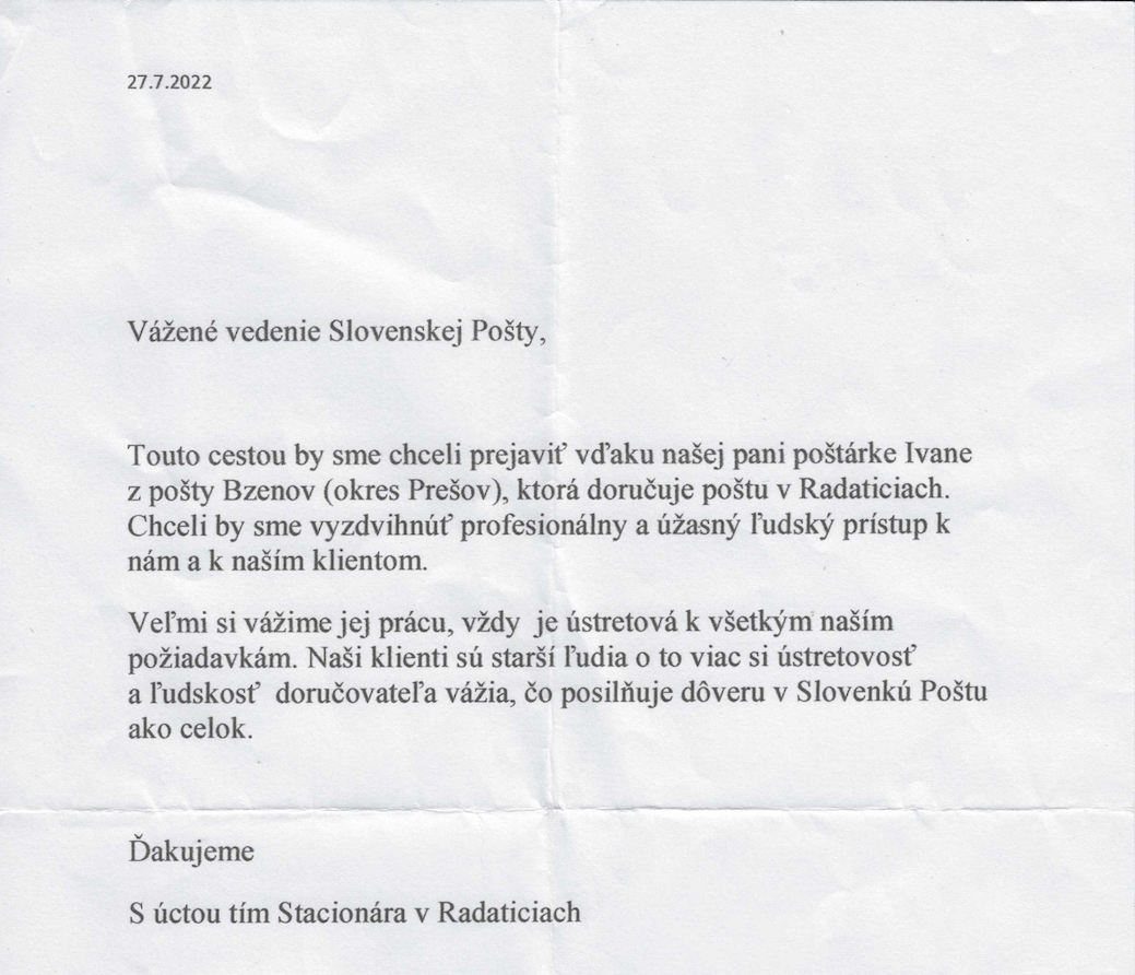 som rada, že mám v kolektíve zamestnanca, ktorý robí dobré meno Slovenskej pošte ako aj celému kolektívu pošty Bzenov. Práca na pošte nie je jednoduchá a nie každý sa hodí na prácu s klientmi a pritom byť milá, ochotná a usmiata aj v tomto náročnom období. Ivanka, poštová doručovateľka Pošty Bzenov, je ústretová, snaživá, šikovná a plná optimizmu. Veľmi sa teším, že ju máme v kolektíve. Ivanke prajem, aby sa jej aj naďalej darila práca, ktorá prináša jej i ostatným potešenie a prospech.