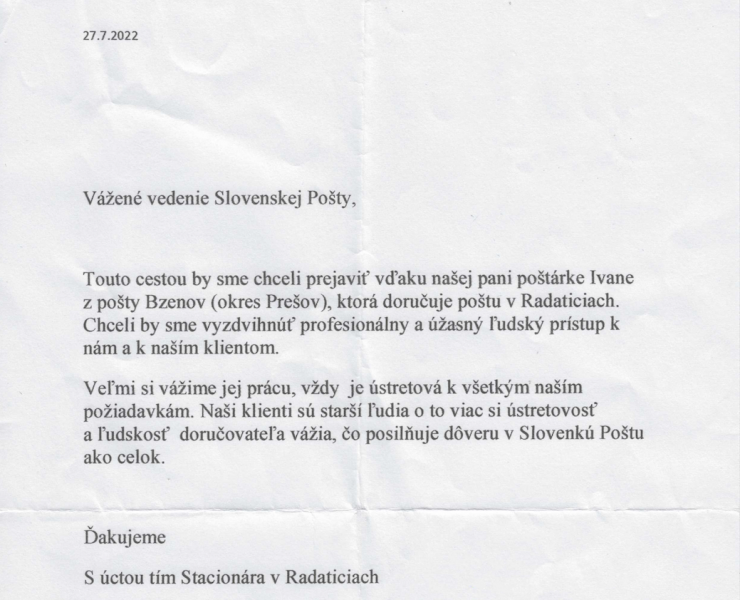 Dobrý deň, som rada, že mám v kolektíve zamestnanca, ktorý robí dobré meno Slovenskej pošte…