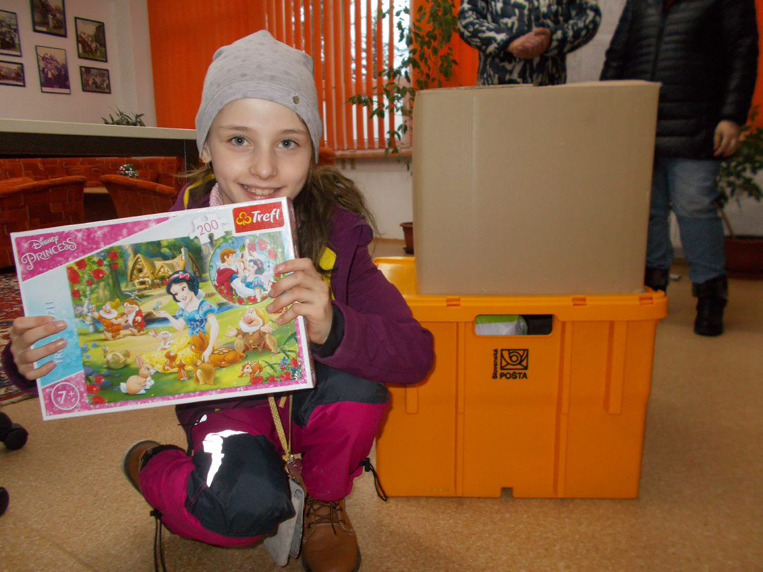 Spolu s podporou p. vedúcej Ing. Ľudmily Rekeneiovej sme oslovili kolektív doručovateľov a aj ostatných zamestnancov pošty Poprad 1 a vyzbierali sme pre Elenku oblečenie, hračky, školské pomôcky, sladkosti a finančnú pomoc, ktorú sme jej aj za prítomnosti jej ocka, p. zástupkyne a p. triednej učiteľky odovzdali dňa 19. decembra 2019 v Spojenej škole na Ulici Mládeže v Poprade.