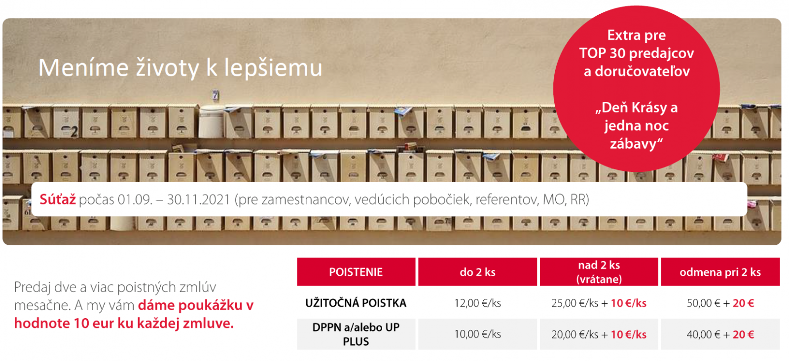 Poštová poisťovňa si v termíne od 1.9. do 30.11.2021 pre predajcov poistenia pripravila zaujímavú súťaž, ktorá je zameraná na predaj troch poistení – Životné poistenie Užitočná poistka, Detské poistenie pre nezbedníkov a Úrazové poistenie Plus.