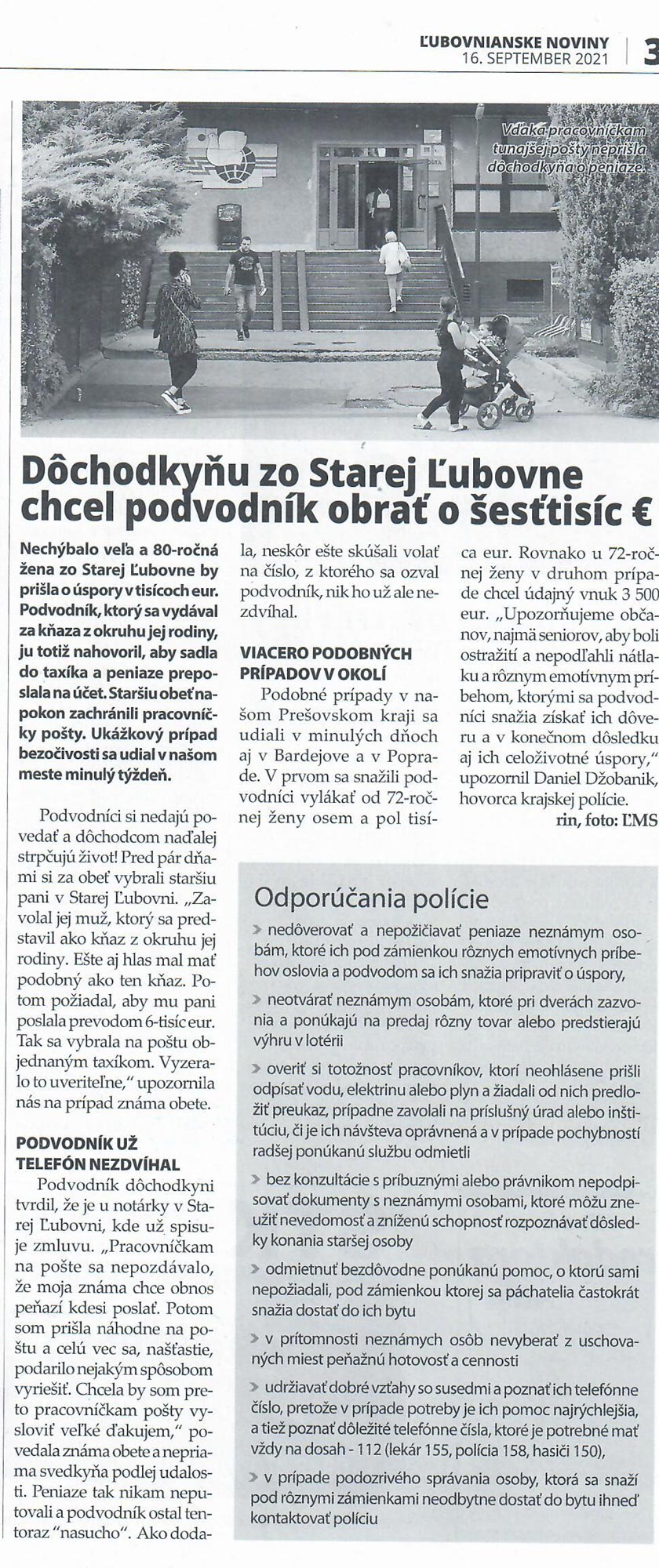 dňa 16. septembra 2021 vyšiel v Ľubovnianskych novinách článok o našej pracovníčke na pošte Stará Ľubovňa. Našej kolegyni bolo vyjadrené poďakovanie zo strany klientky. Veľkú zásluhu na tom má p. vedúca pošty Martina Mačugová, vďaka ktorej stará pani neprišla o celoživotné úspory. Myslím si, že takýto čin si zaslúži verejné poďakovanie aj v rámci slovenskej pošty nie len v okresných novinách.