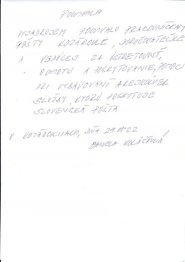Pošta Kozárovce patrí medzi kľúčové pošty MO NR V. Zlaté Moravce. Po stabilizácii kolektívu pošty ako aj po organizačnej zmene k 1. 11. 2022 – obidve zamestnankyne – vedúca pošty Mgr. Lucka Režoňová a poštová doručovateľka Anička Opltová sa naplno venujú svojej práci. V tejto profesii sa našli. V obchodných výsledkov dosahujú vynikajúce výsledky. Klientom vychádzajú maximálne v ústrety, sú milé, vždy s úsmevom na tvári. Udržujú výborné vzťahy aj s bývalými zamestnankyňami – už dôchodkyňami.