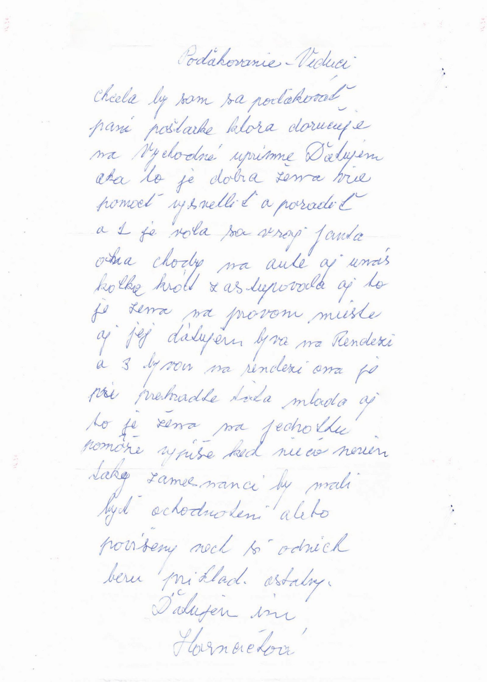 Veľmi ma potešila pani Hornáčková z Rače prinesením listu s pochvalou na pracovníčky našej pošty. Doručovateľka Jana Rašmanová pracuje na pošte 17 rokov, doručovateľka Jana Kýpeťová 17 rokov, doručovateľka Lenka Dlhošová 7 rokov, priehradková pracovníčka Lucia Kollárová 15 rokov. Všetky vykonávajú svoju prácu zodpovedne, vedia pomôcť a poradiť zákazníkom. Myslím, že svoju prácu majú rady, čomu nasvedčujú ich odpracované roky pre Slovenskú poštu.