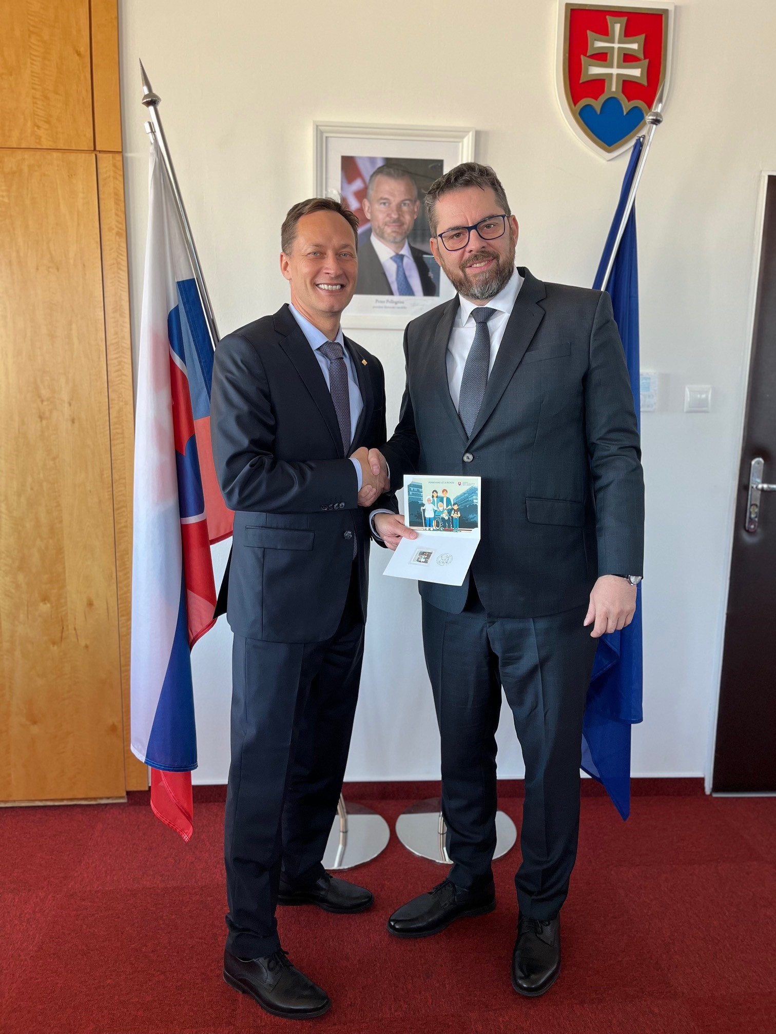 Generálny riaditeľ a generálny tajomník služobného úradu Ústredia práce, sociálnych vecí a rodiny Peter Ormandy si z rúk nášho generálneho riaditeľa Vladislava Kupku prevzal poštovú známku.