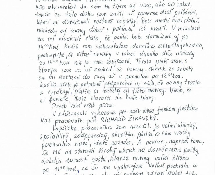 „Dobrý deň, týmto by som chcel vyjadriť poďakovanie pracovníčkam a pani vedúcej prevádzky na pošte…