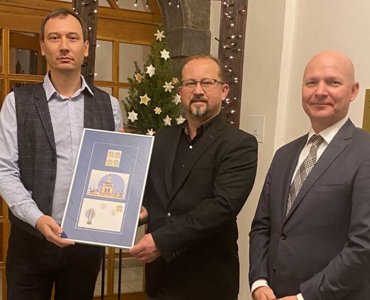 Adrian Ferda – autor známky, Michal Čajka – riaditeľ Oravskej galérie, Martin Vančo – vedúci…